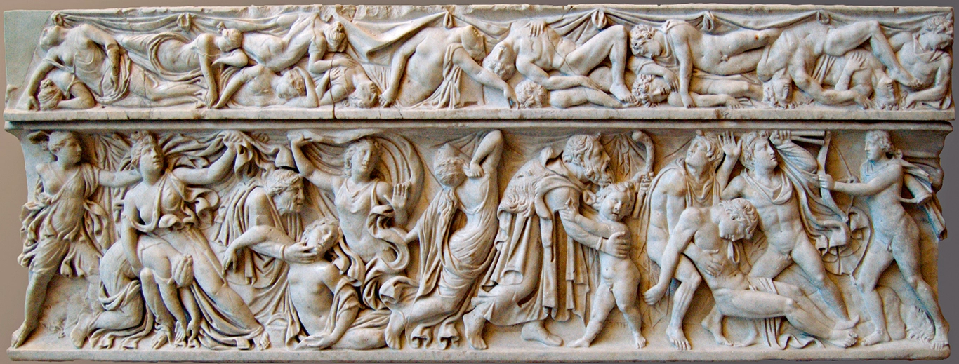 Romernes opfattelse af efterlivet er ikke entydig, og en række spørgsmål melder sig, når man skal forsøge at forklare deres syn på det hinsides. Nogle af svarene kan dog findes på de relieffer, der i 200-tallet e.Kr. dominerede på middelklassens sarkofager, dvs. ligkister. Særligt de mytologiske fortællinger var populære. F.eks. det såkaldte Niobiderov, hvor gudesøskendeparret Artemis og Apollon dræber Niobe og hendes 14 børn. Motivet synes da også med sine makabre fremstillinger af død og ulykke at være et oplagt valg i en begravelsessammenhæng.